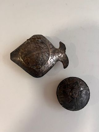 1. Ave: Salero fabricado en España en torno a los años cincuenta que representa un pato, realizado en plata de ley contrastada de 925 milésimas. Oxidado por dentro. Sólo decorativo. Pesa 135 gramos y mide 7 centímetros de largo por 3 de ancho y 5 de altura. 2. Caja o joyero de alpaca con inscripción 3. Antiguo tarjetero en plata de ley con contrastes de platero peso 39 gms. 11 x 9 cmts 4. Fuente pequeña de alpaca con contraste. Objetos antiguos. Punzones de calidad.
