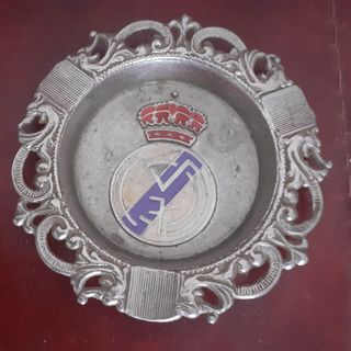 Cenicero de metal, Real Madrid, Futbol Club. En perfecto estado, muy antiguo. Objeto de culto, souvenir, suvenir, recuerdo de Madrid. Diámetro 9 cm. Alpaca o similar, no es plata ni metales preciosos.