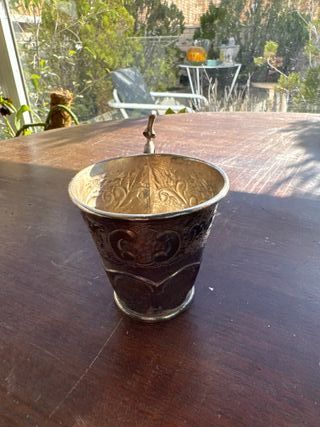Copa antigua de plata labrada con asa decorativa