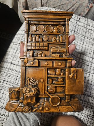 Ponle un toque rústico y acogedor a tu cocina o comedor con esta bonita pieza decorativa. Es un relieve tallado en lo que parece ser cera, que representa una alacena de cocina antigua con todos sus detalles: los platos, las ollas, los cajones y hasta un manojo de ajos. Es un objeto muy original y con mucho encanto, ideal para los amantes de la decoración vintage y el estilo campestre. Está en perfecto estado, listo para colgar.