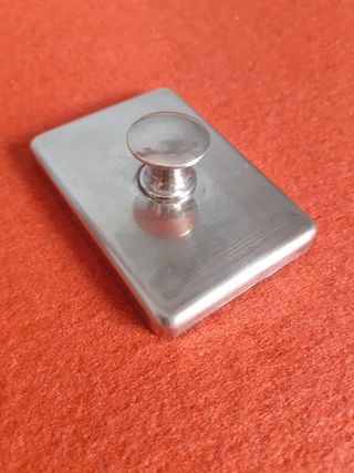 Un elegante secante antiguo, perfecto para añadir un toque clásico a tu escritorio. Objeto de decoración antiguo. - Medidas: 6,5 x 4,5 x 0,7 cm. - Fabricado en plata. - Buen estado.