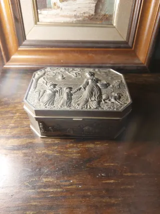 Elegante caja de metal bañada plata con un diseño octogonal y relieves detallados. - Decorada con escenas de figuras humanas y animales. - Acabado metálico plateado. - Ideal como joyero o para guardar pequeños objetos.