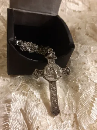 Antigua cruz relicario con trozo de tela de Padre Claret. Ideal para coleccionistas o como objeto devocional. - Diseño detallado. - Material metálico, plateado , con cadena plateada.(Dispongo de varios tamaños, material composicion , y colores de plata plata y dorado,anunciadas en wallaop, esta el de las mas pequeñas, 5cm de largo sin contar anilla)). - Bien conservada.Etrega en mano.50€
