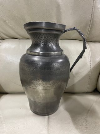 Jarra antigua con acabado plateado, de diseño clásico y elegante. Pieza decorativa con líneas armoniosas y pátina propia del paso del tiempo, que realza su carácter y autenticidad. Ideal como objeto decorativo, para coleccionistas o para aportar un toque vintage a cualquier estancia.