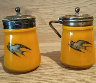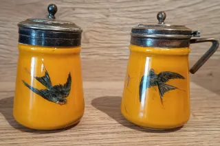 Antiguo y raro conjunto de mostacero y un pimentero. Fabricado con una gruesa capa exterior de cristal transparente con un efecto «sándwich»pintado en el interior con dos figuras de pájaro. Las tapas no sé si son plata o alpaca ya que al limpiar ennegrecen. Origen inglés, algunos objetos similares de esa marca y tipología de fabricación datan de 1920. Pieza de coleccionista