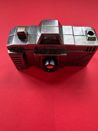 Mechero con diseño de cámara fotográfica antigua. - Modelo: Chinon CM-5. - Cuerpo metálico plateado y rojo. - Detalle de objetivo y visor.