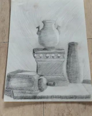 Antiguo dibujo a lápiz de un bodegón. bodegón o naturaleza muerta dibujado a lápiz. Este género artístico representa objetos inanimados, como los jarrones y el bloque que se ven en la obra. - Representación detallada de objetos. - Técnica de sombreado a lápiz. Las fotografías son parte de la descripción del producto Fase,Antiguo,antigua,bargueño,buro,secreter,siglo,tallado,tallada,torneada,nogal,medieval,monedas,mueble,cobre,bronce,victoriano,época,isabelino,manuscrito,latín,romano,años,vintage,antigüedad,bonito,único,salón,decoración,armario,exclusivo,escritorio,entrada,comedor,entradita,recibidor,estilo,barroco,madera,ard deco,r