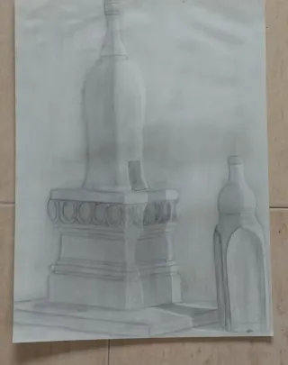Dibujo antiguo a lápiz de un bodegón con botellas y base decorada. - Técnica: Lápiz sobre papel. - Representación de objetos cotidianos con sombreado detallado. Las fotografías son parte de la descripción del producto Fase,Antiguo,antigua,bargueño,buro,secreter,siglo,tallado,tallada,torneada,nogal,medieval,monedas,mueble,cobre,bronce,victoriano,época,isabelino,manuscrito,latín,romano,años,vintage,antigüedad,bonito,único,salón,decoración,armario,exclusivo,escritorio,entrada,comedor,entradita,recibidor,estilo,barroco,madera,ard deco,rural,herencia,rococó,plata,oro,cerámica,cuadro,lienzo,oleo,pintura,serigrafía