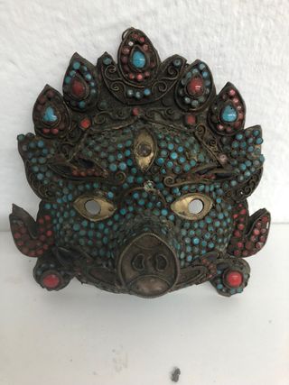 Rara y antigua mascara de cobre con piedras naturales yo creo que lapizlazuri y coral por el color y el aspecto eso es lo que parecen Súper rara y curiosa un objeto unico para adornar tu casa o ampliar tu coleccion El estado es el que muestran las fotos que forman parte de la descripcion Tengo dos mas del mismo estilo en venta y tambien una de madera mira mi perfil