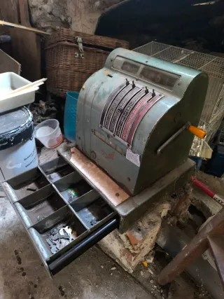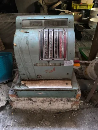 Registradora antigua de color verde azulado. Un objeto clásico con un diseño retro. - Mecanismo de palancas. - Cajón para dinero.