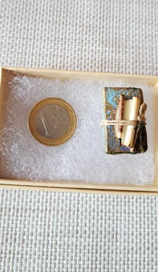 Broche “Mini Libro Mágico” artesanal.- Hecho a mano con mimo y atención al detalle, este broche semeja un libro antiguo lleno de magia, acompañado de un pequeño pergamino y su lapicero en miniatura que evocan historias por descubrir. Cada elemento está cuidadosamente trabajado para transmitir el encanto de los objetos que parecen cobrar vida en los cuentos. Su cierre de seguridad en color bronce antiguo aporta un toque vintage y asegura que puedas llevarlo con total confianza. Una pieza única, ideal como regalo. Más piezas mágicas y artesanales en mi perfil #miniaturas#regaloOriginal#brocheMagico#artesania#objetoUnico#