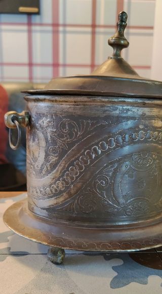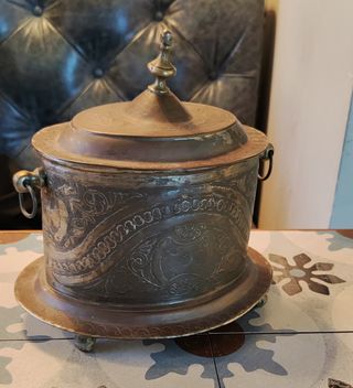 Preciosa auténtica rareza. Antiguo contenedor para the u otras esencias en metal cincelado. Tapa y asas con anillos laterales y plato con patas como base soldado al cuerpo. Los patrones en relieve dan al objeto una refinada elegancia. Pieza de artesanía árabe que puede añadir un toque a cualquier espacio. Objeto preciado para coleccionistas y/o gente que sepa apreciar ese tipo de arte marroquí. 25x23 cm aprox. Normales señales de vida. Urna, bracero, bombonera, latón, recipiente, labrado, antigüedades, decoración, decorazione, colección, collezione, original, autentico, antique box, caja, brass.