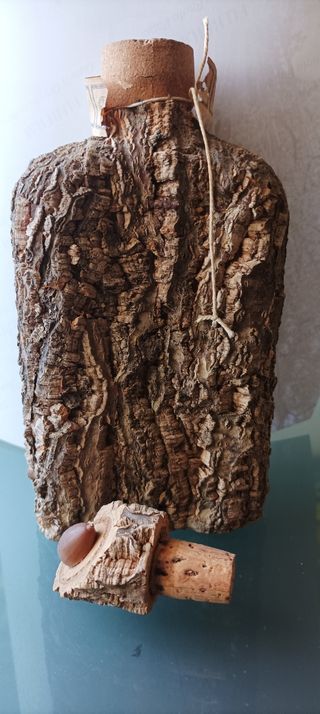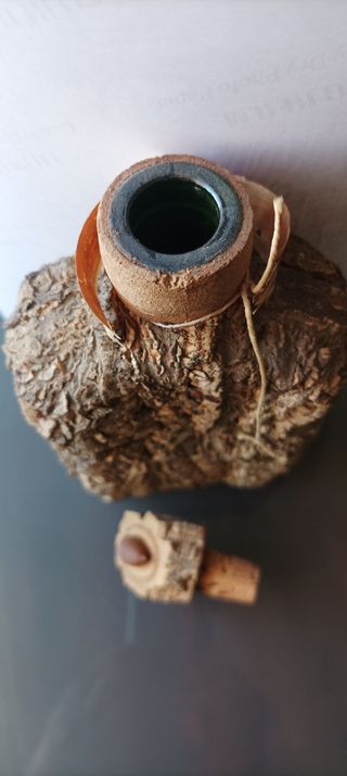 Preciosa botella antigua, vacía, para decoración o coleccionismo. Ideal para amantes de objetos vintage. - Botella de aguardiente de medronho. - Material: corcho. - Diseño rústico y único. - Perfecto estado de conservación.