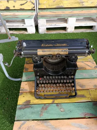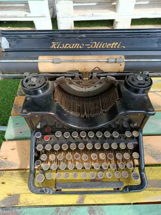 Máquina de escribir antigua de la marca Hispano-Olivetti. Un objeto clásico con un diseño vintage. - Cuerpo principal en color negro. - Teclado con teclas redondas. - Detalles en color dorado en la parte superior.