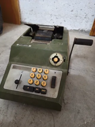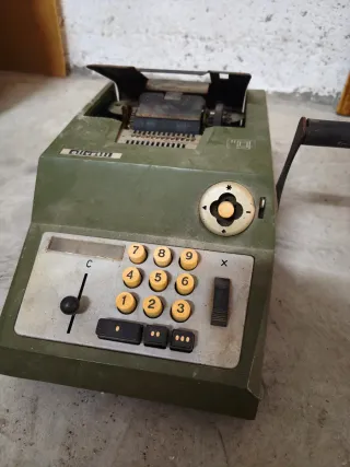 Calculadora mecánica Olivetti de color verde. Un objeto vintage con un diseño clásico. - Teclado numérico. - Palanca de operación. - Asa lateral para manivela.