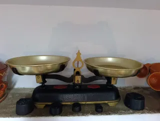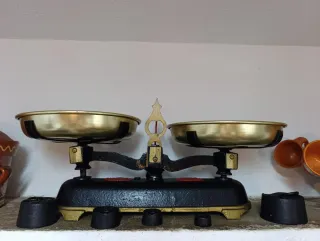 Balanza de cocina antigua con un diseño clásico y robusto. Fabricada en hierro y latón, es un objeto decorativo con historia. - Base de hierro negro con detalles dorados. - Dos platillos redondos de latón. - Mecanismo de pesaje visible.