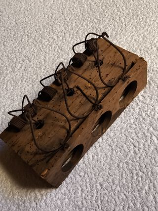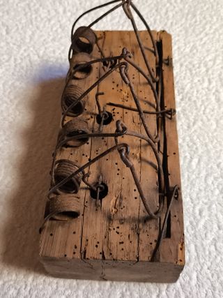 Ratonera antigua de madera y hierro, restaurada y tratada. Capacidad para 3 cuerpos. Medidas: 24 x 10 x 14 Está limpia, tratada con anticarcoma y barnizada para su posterior colocacion como objeto antiguo. Muy original y vistoso para decoración de una casa rural, txoco, bodega, casa antigua, recibidor, atrezzo, escaparatismo, antigüedad, coleccionistas, exposiciones, etc. Le falta un pequeño gancho que se puede sustituir a juicio del comprador por una punta oxidada o un clavo. Puedes agrupar varios artículos y así ahorrar costes de envío.