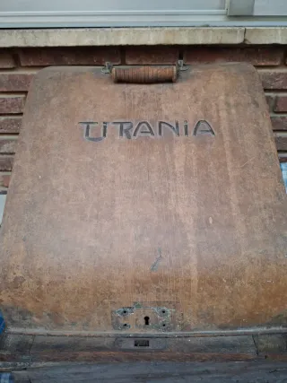 Máquina de escribir antigua de la marca Urania, fabricada alrededor de 1940. Un objeto con un diseño clásico y un toque retro. - Cuerpo de metal negro. - Teclado con teclas redondas. - Detalles dorados en los laterales.