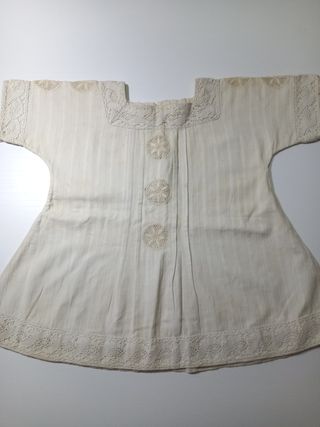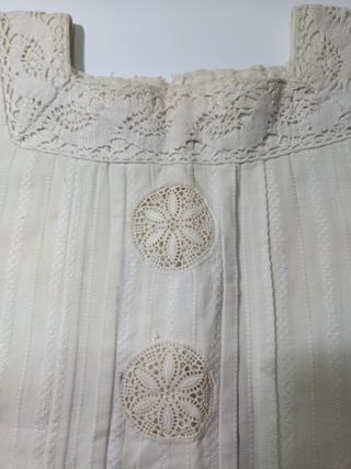Muy Antigua prenda de vestir, puede ser un vestido imagen religiosa, o niña, muñeca o camiseta mujer. Tela tipo pique con dibujo, encaje de ganchillo, y encaje de aguja. S XIX, principios XX. Medidas de sisa a sisa 39cm de largo 48 cm. Muy bien conservada. Mas en mi perfil. Ropa antigua, objetos antiguos, ropa tradicional, indumentaria antigua, traje regional.