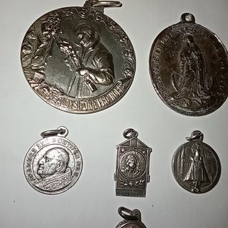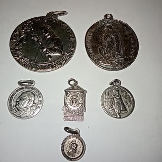 Se venden seis medallas antiguas de temática religiosa. Dos son de mayor tamaño y cuatro más pequeñas. Todas presentan un diseño detallado y parecen estar en buen estado de conservación. - Son ideales para coleccionistas o amantes de objetos antiguos con valor histórico y religioso. - Se incluyen las seis medallas mostradas en las imágenes.