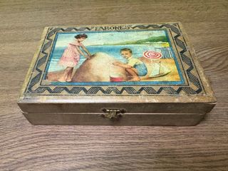 Preciosa caja antigua de madera, ideal para guardar labores o como objeto decorativo. - Diseño vintage con ilustración. - Cierre metálico.