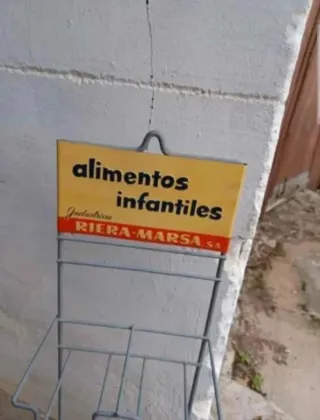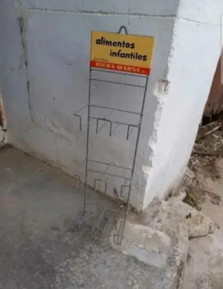 Expositor metálico de la marca Riera Marsa para alimentos infantiles. Es una pieza antigua y se encuentra en buen estado de conservación, aunque presenta señales de uso. - Ideal para coleccionistas de objetos vintage o para decoración. - Fabricado en metal. - Contiene el logo de Riera Marsa. Dimensiones, alto 60cm, ancho 16cm, fondo 10cm