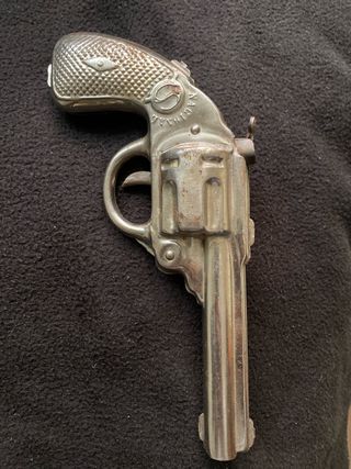 Pistola de juguete antigua de la marca Nacional. Un objeto de colección con un diseño clásico. - Fabricada en metal. - Detalle de textura en la empuñadura. - Grabado Nacional en el lateral.