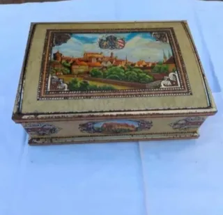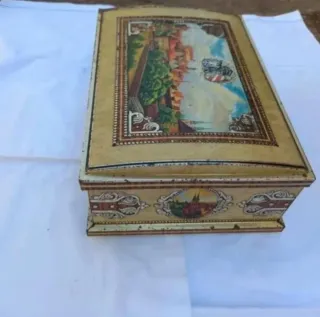 Preciosa caja metálica antigua con un diseño encantador. Ideal para coleccionistas o decoración. - Presenta un diseño con imágenes de una ciudad antigua. - La caja está hecha de metal y muestra señales de desgaste por el paso del tiempo, lo que le da un encanto único. - Perfecta para guardar pequeños objetos o como pieza decorativa.
