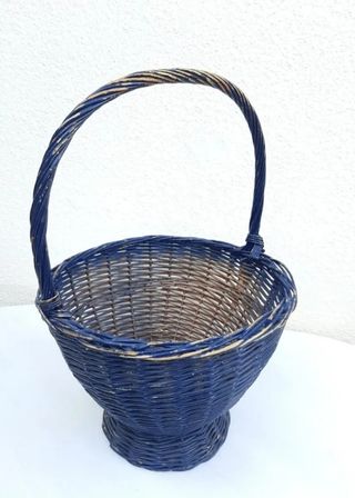 Preciosa cesta de mimbre pintada de azul, con un estilo vintage. Ideal para decoración o para guardar objetos. - Cesta de mimbre artesanal. - Color azul. - Asa superior. - Estilo vintage.Cesta redonda de Mimbre Con Asa grande Auténtica Vintage Tiene más de 60 años Antiguamente era un costurero Pintada de color azul marino Hecha a mano y pintada a mano En buen estado. Lo único que la pintura no está del todo perfecta. Está un poco saltada del uso. Pero buen estado teniendo en cuenta que es una pieza antigua MEDIDAS Diámetro inferior 21cm Diámetro superior 34cm Altura 36cm sin contar con el asa Altura 53cm contando con el asa