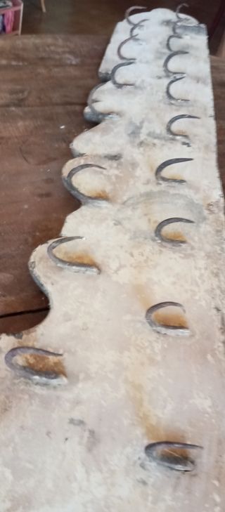 Preciosa clavera antigua de madera, ideal para colgar objetos. Es una pieza única con encanto rústico. Está pieza se utilizaba en otra época para colocarla en las cocinas y colgar todo tipo de cazuelas y menaje de cocina. - Fabricada en madera. - Presenta ganchos metálicos. - Diseño con forma ondulada. Para restaurar,la madera está pintada de blanco.