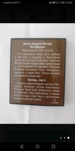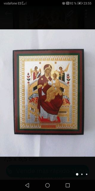 Icono religioso de la Virgen de Iver con el Niño Jesús. Muy bonito y en perfecto estado. - Representación de la Virgen de Iver con Niño Jesús. - Material: frontal cubierto de plata bilaminada montado sobre un marco de madera. - Anilla en la parte posterior para colgarlo. - Medidas: 14,5 cm alto x 12, 5 cm ancho. Hago envíos. Más objetos religiosos y antiguos en mi perfil.