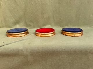 Se ofrece un conjunto de tres peanas antiguas de forma ovalada, elaboradas en madera tallada y realzadas con pan de oro. Cada base presenta un tapizado superior de terciopelo (dos en color azul y una en rojo), ideal para la exposición de figuras religiosas, esculturas, fanales u objetos decorativos. Sus dimensiones son 12 cm de largo por 3 cm de alto. A pesar de los años, se encuentran en buen estado de conservación, mostrando el desgaste natural propio de piezas antiguas, lo que les añade carácter y autenticidad. Precio por unidad 75 euros. Precio por lote 190€ - Madera tallada a mano. - Acabado en pan de oro. - Diseño circular.