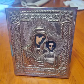 Icono religioso estilo bizantino (Hodigitria). Frontal en metal repujado bañado en plata, con gran detalle en relieve. En la parte inferior lleva marca del fabricante repujada en el metal: ➡️ CREMIL (taller que realizó iconos metálicos entre los años 60–80) ✔ Metal repujado (no plástico) ✔ Imagen central de la Virgen con Niño incrustada ✔ Base trasera en madera maciza con soporte ✔ Procede de tienda clásica de Barcelona (etiqueta original en la parte trasera) Ideal para amantes de objetos antiguos y religiosos 📏 Medidas: 18 × 14 cm Hago envios por Wallapop opcion correos no IMPOST ni GLS.