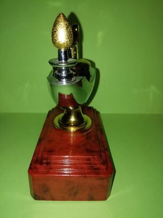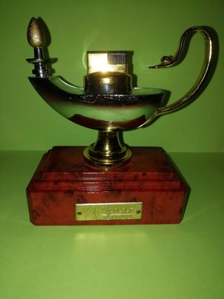 Original mechero con forma de lámpara de aceite antigua. Un objeto decorativo y funcional. No Realizo Envíos. En efectivo, nada de Bizum. Solo para trato en mano, Viernes por las tardes y fines de semana todo el día. - Base de imitación a madera con acabado marmoleado. ( plástico ) - Cuerpo de la lámpara cromado y dorado. - Detalle dorado en forma de cisne en el asa. - Incluye mechero. Recargable - Completamente funcional.