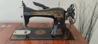 Máquina de coser antigua de la marca Singer, fabricada en Gran Bretaña. Un objeto con un diseño clásico y decorativo. - Cuerpo de metal negro con detalles dorados. - Inscripción The Singer Manufacturing Co.. - Volante lateral para operación manual. - Funciona perfectamente. - El mueble está bien. No tiene ruedas.