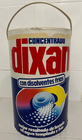 ¡Un auténtico viaje a la infancia para los nacidos en los 70 y 80! Icónico envase de detergente Dixan 5 Kg, el mítico cubo que todas las madres reutilizaban para guardar juguetes. IMPORTANTE: El envase se vende SIN la tapa original. Es perfecto para coleccionistas de memorabilia o decoración retro. Producto: Envase/Cubo de plástico rígido de detergente Dixan. Capacidad Original: 5 Kg. Dimensiones: Alto: 36 cm, Diámetro: 22,5 cm. Estado: Artículo vintage con señales de uso y paso del tiempo esperables en un objeto de los 80. El cubo está en buen estado general, sin tapa, con asa intacta.