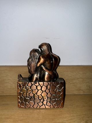 Mechero vintage de sobremesa con diseño artístico de pareja abrazada. Acabado metálico efecto bronce. Pieza decorativa original, ideal para coleccionistas o como objeto decorativo retro. Presenta desgaste normal por el paso del tiempo, acorde a su antigüedad. Se vende tal cual se ve en las fotos. 🔵Funciona