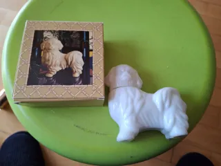 Figura perfume decorativa de perro Royal Pekinés de Avon. - Diseño vintage. - Material: Vidrio opalino blanco. - Aroma roses roses. - Objeto de colección.