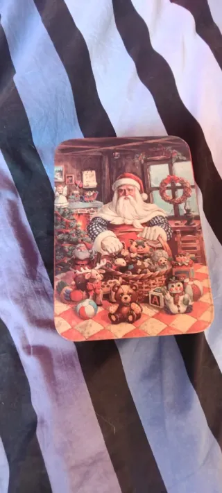 Bonita caja metálica con diseño navideño, ideal para guardar pequeños objetos o como elemento decorativo. - Ilustraciones de Santa Claus y escenas festivas. - Bordes en color rojo. - Diseño con motivos de cuadros y muñecos de nieve.