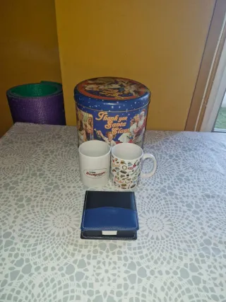 Bonita gallettera vintage con temática navideña. Ideal para almacenar galletas o como objeto decorativo. - Diseño circular con escenas de Papá Noel y adornos festivos. - Tapa con cierre. - Material: Metal. Incluye diseño tazas desayuno y un bloc de notas en piel.