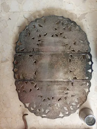 Bandeja decorativa o vide-poche vintage fabricada en metal, con diseño de estilo brutalista y acabado artesanal. Pieza sólida y pesada، ideal para: Vide-poche (llaves, monedas, accesorios) Decoración de mesa o entrada Objeto decorativo vintage Presenta marca grabada en la parte metálica (ver fotos). lo que se vende tal como se muestra en las imágenes. 📐 Estado: Buen estado general, con señales de uso normales acordes a su antigüedad. 📦 Entrega: Entrega en mano O envío disponible, gastos de envío a cargo del comprador 📩 Para cualquier duda contactar conmigo.