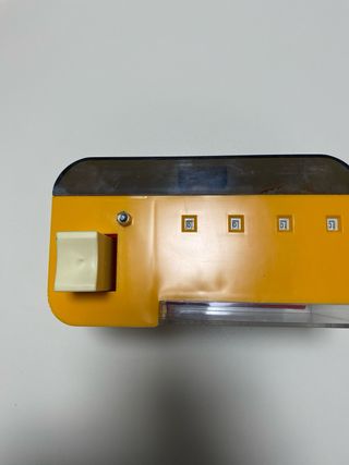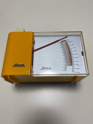 Báscula de cocina vintage de la marca Bernar. Un objeto decorativo con un diseño retro. Contiene caja original. - Cuerpo de plástico amarillo. - Plato de pesaje. - Indicador de peso con escala hasta 1000g.