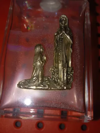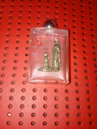 Este frasco de cristal vintage presenta un diseño único con figuras religiosas en su interior. Ideal para coleccionistas o como objeto decorativo En la época era un frasco de agua bendita ahora se puede usar como frasco para rellenar perfumes o colonias. - Material: Cristal. - Diseño: Figuras religiosas Metalica. - Estilo: Vintage.