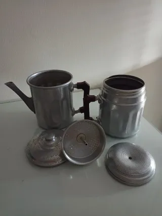 Cafetera combinada de estilo vintage, fabricada en aluminio. Su diseño clásico la hace un objeto decorativo y funcional. - Material: Aluminio. - Asas de baquelita. - Dos cuerpos apilables.
