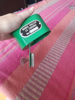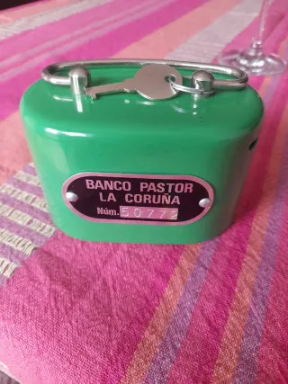 Hucha antigua del Banco Pastor de La Coruña. Un objeto de colección con un diseño clásico. - Color verde brillante. - Incluye su llave original. - Número de serie: 50772.