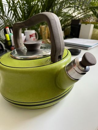 Tetera vintage de color verde brillante con detalles en negro. Su diseño clásico la hace un objeto decorativo. - Dimensiones: 20 x 20 cm aprox.