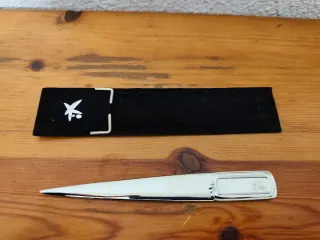Abrecartas vintage de la Caja de Pensiones. Es de plata de la marca Cunill orfebres. Un objeto clásico y elegante. Medidas: 16,5cm x 2cm. ⚠️Ideal coleccionistas. Nuevo, en su envase de ante original. - Diseño plata pulida. - Marca grabada en el mango.