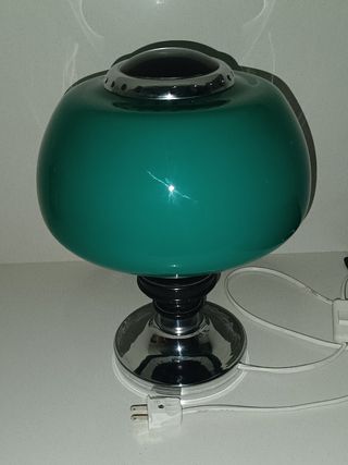 Preciosa lámpara de sobremesa. Vintage. Años 70. Tulipa cristal verde. Altura 36 cm. Diámetro tulipa en base 26 cm. Altura tulipa 16. Preciosa. Excelente estado. Pie en madera y metal. Coleccionistas y amantes de objetos vintage