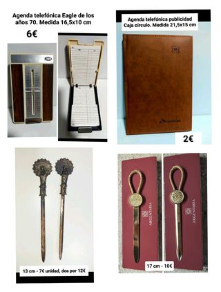 - Abrecartas Virgen del Pilar - Agenda telefónica Caja círculo - Agenda telefónica Eagle - Cubiletes vintage ( Automecanic y Banco Hispano Americano ) - Escribanía moderna con bolas antiestrés - Bolígrafo en soporte de ágata - Colección marcapáginas - Abrecartas Argentaria - Bolígrafo Iberduero ( cambiar recambio ) - Dos bolígrafos madera ? ( cambiar recambio ) - Marcapáginas metálico y Guggenheim Mando fotos e información detallada.
