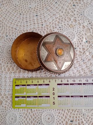 Preciosa caja de metal cobre con diseño marroquí. Ideal para guardar pequeños objetos. - De estilo vintage. - Tiene forma redonda. - Presenta un color cobre y detalles en plata. - Decorada con una estrella de David. - Incluye una pequeña piedra en el centro de la estrella.